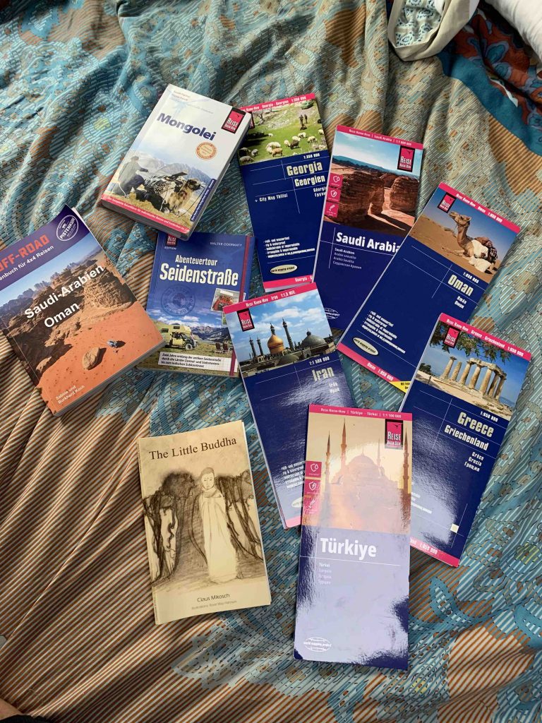 Einen großen Stapel Papierkarten und Reiseführer, in Papierform und als Ebook,  – zumindest schon mal für die nächsten Länder, die auf der Liste stehen. Ich weiß, dass man auch fast alles im Internet findet, dennoch schmökere ich unheimlich gerne in Reiseführern.