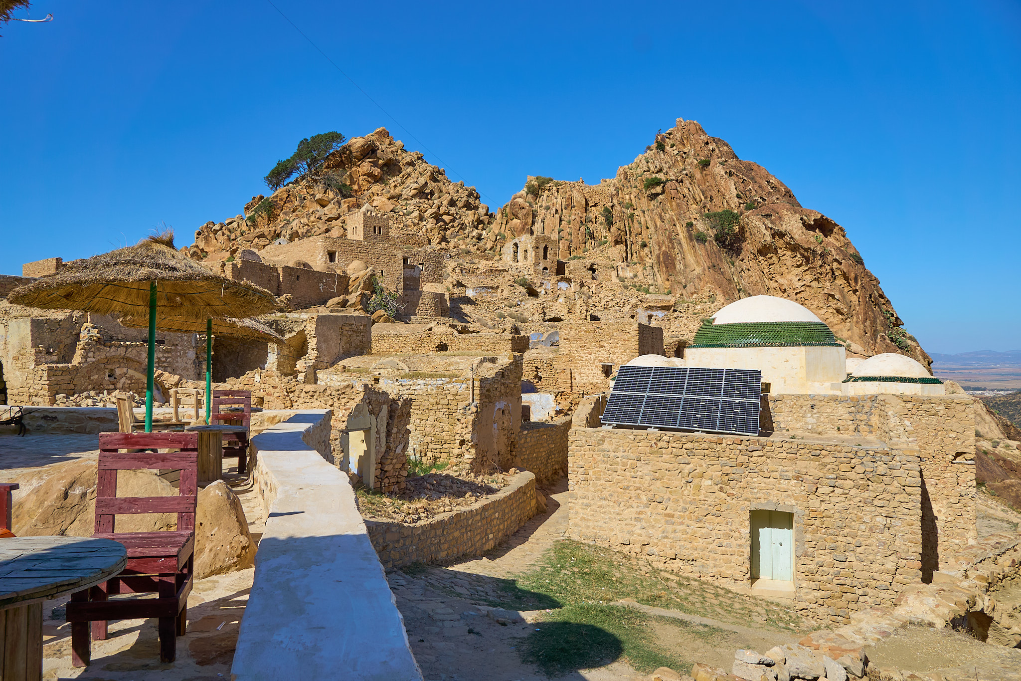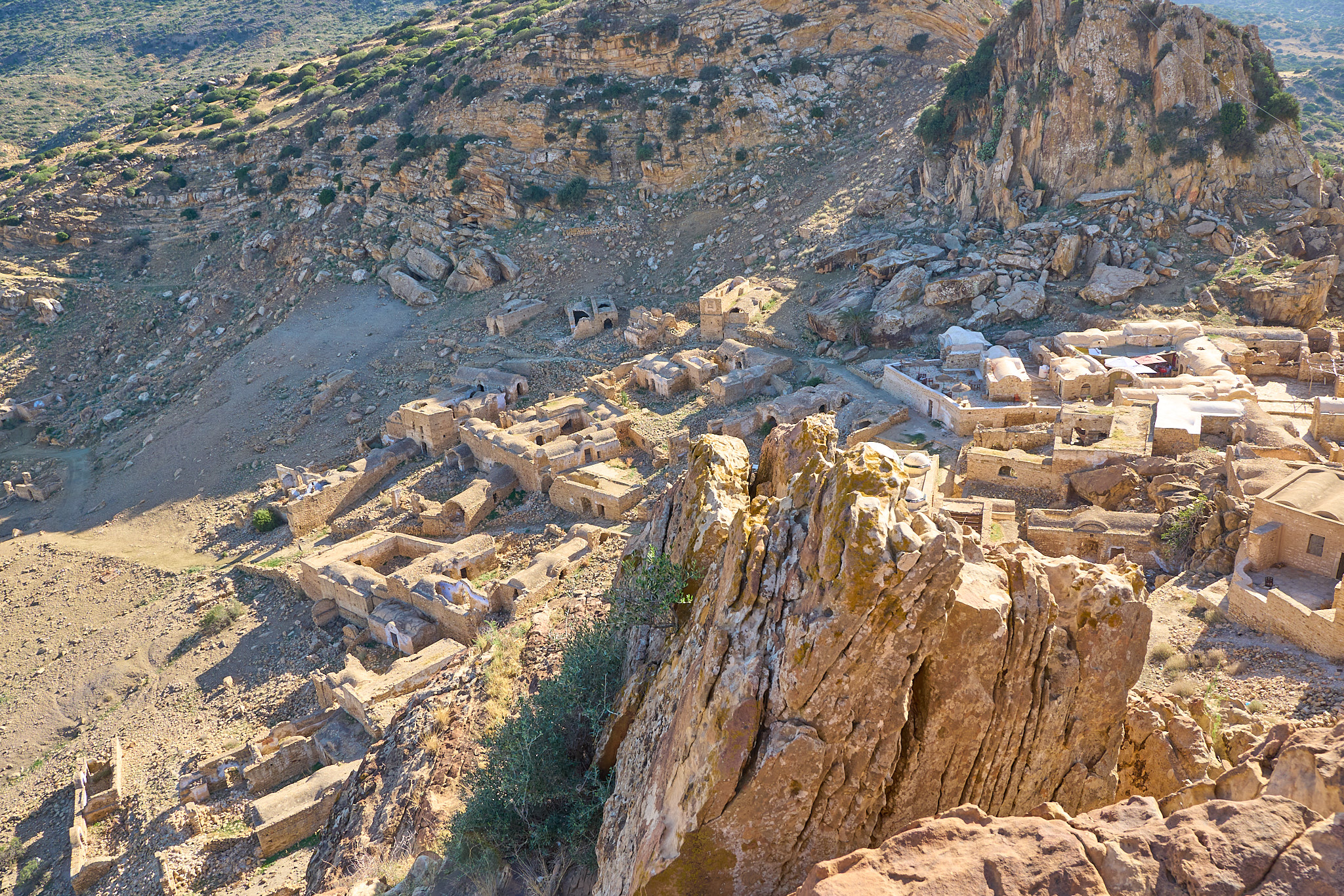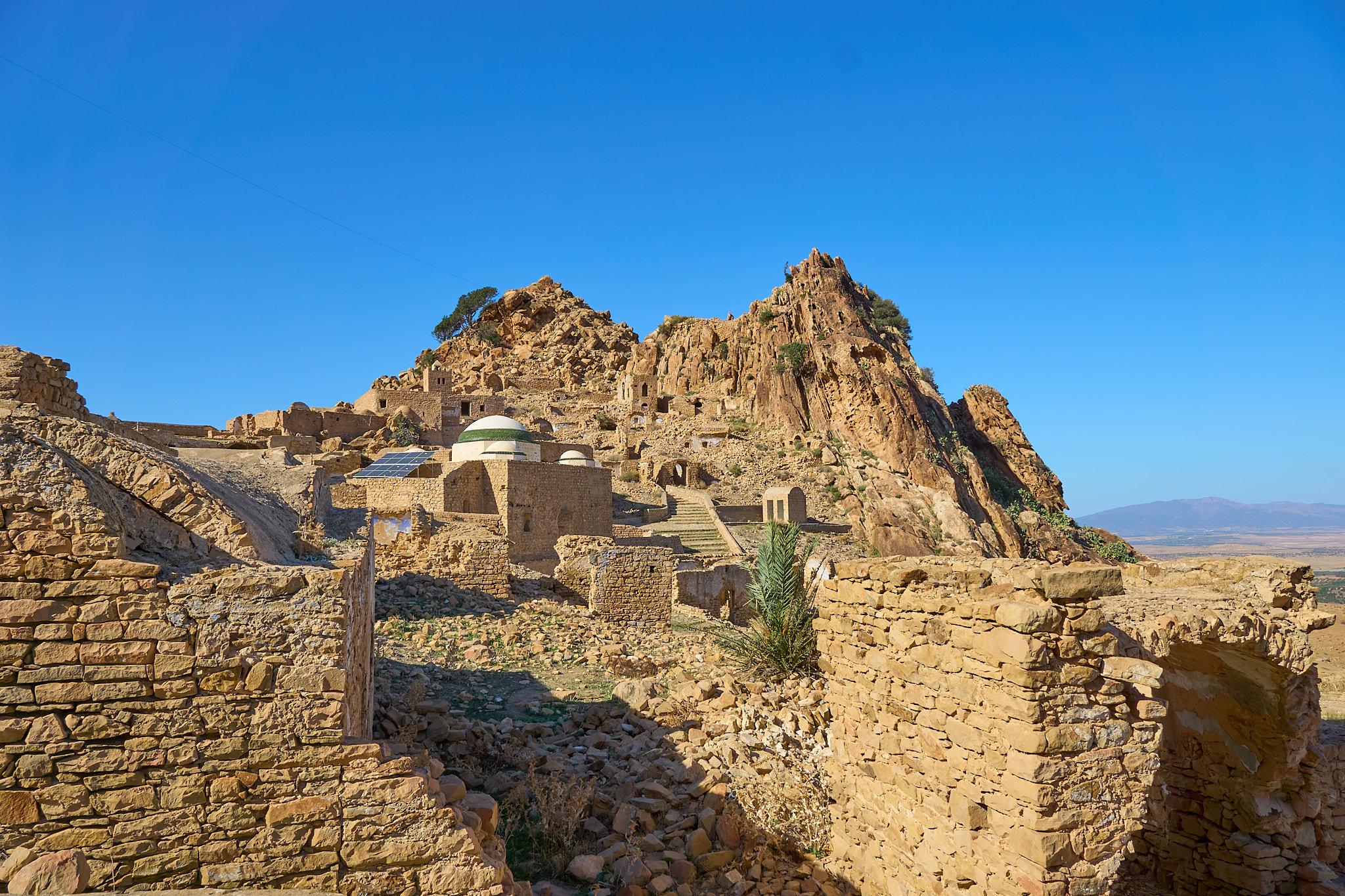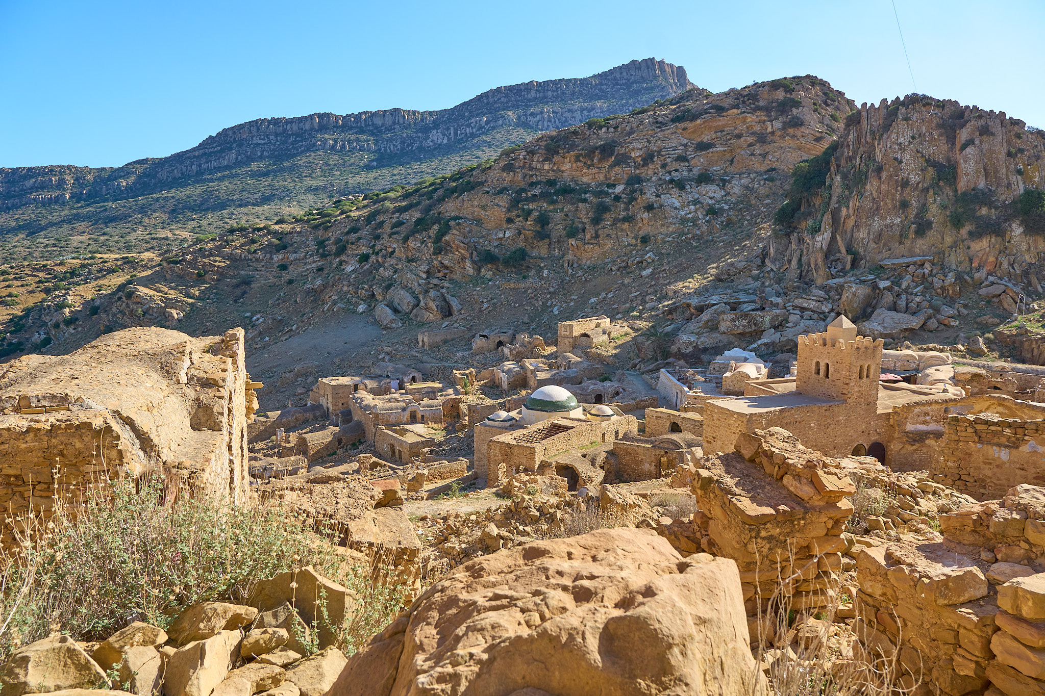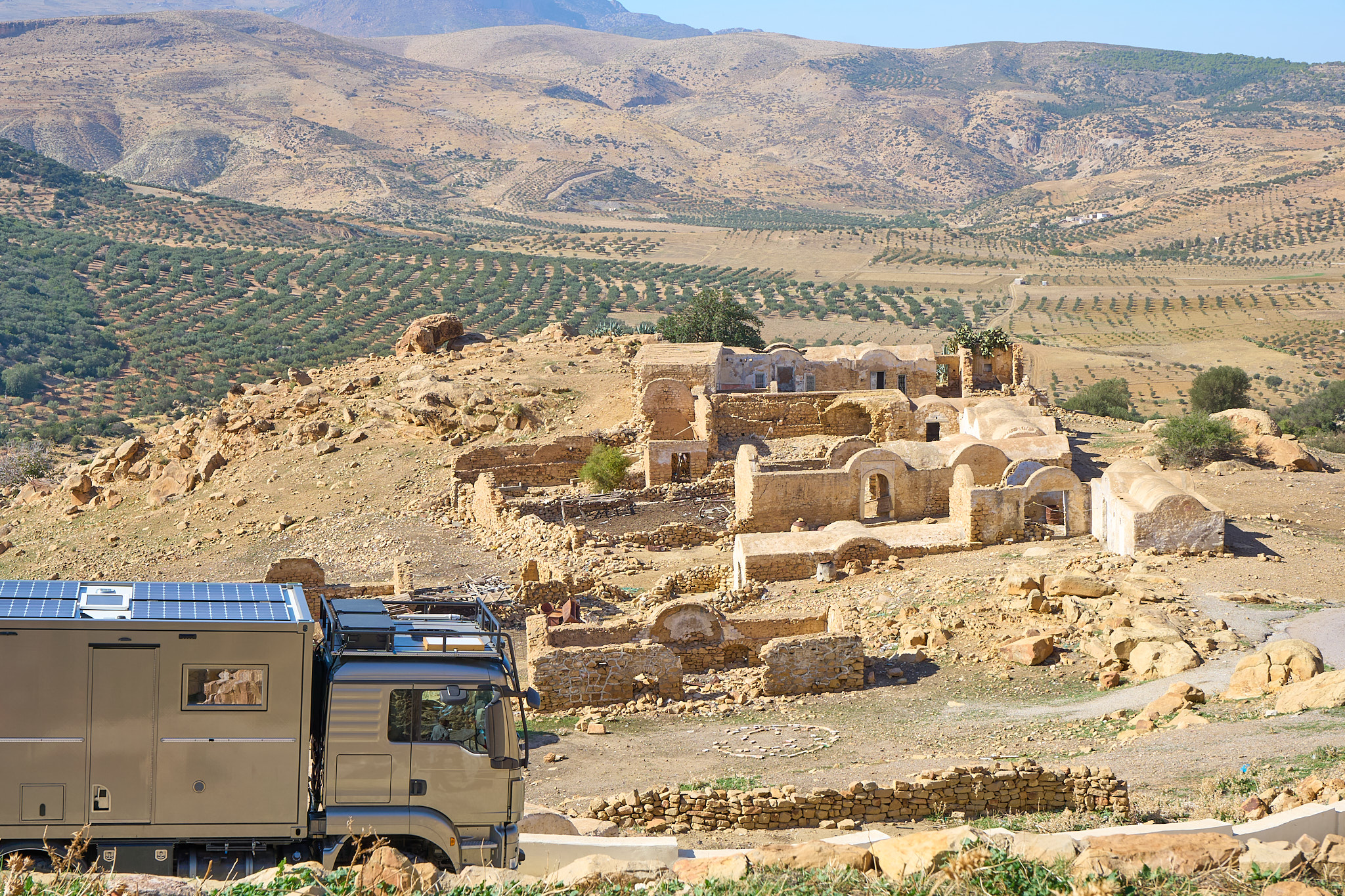 Auf dem Weg gen Süden entdeckten wir auf der Karte den Ort Zriba El Olya, eine alte Berbersiedlung, die wohl 1950 verlassen wurde. In der Nähe wurde eine neue Siedlung mit dem Namen Zriba Hammam errichtet. Angeblich wurden die Bewohner von dem damaligen „Befehlshaber“ gezwungen, umzusiedeln. So hatte es uns – verflixt, ich habe seinen Namen vergessen – einer der wenigen verbliebenen Bewohner des Dorfes erklärt. Heute leben nur noch zwei Familien im Dorf, und zwar in der ehemaligen Schule. Das fantastisch gelegene und wirklich hübsche Dorf soll touristisch erschlossen werden. Als wir dort waren, waren wir die einzigen Touristen – lediglich ein dreiköpfiges tunesisches Fernsehteam war vor Ort und drehte eine Reportage über den Ort. Vermutlich wird mit entsprechendem Marketing der Ort in Zukunft nicht mehr ganz so ruhig sein 😉 Die Zufahrtsstraße dorthin wurde schon neu gemacht und offensichtlich für den Transport von Touristen mit großen Bussen vorbereitet.
