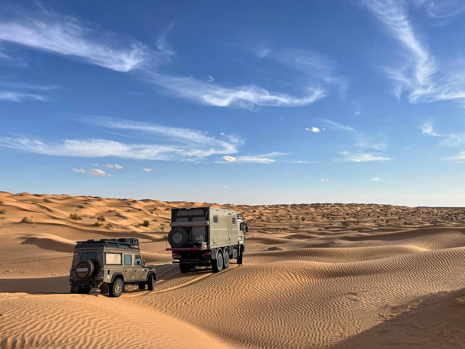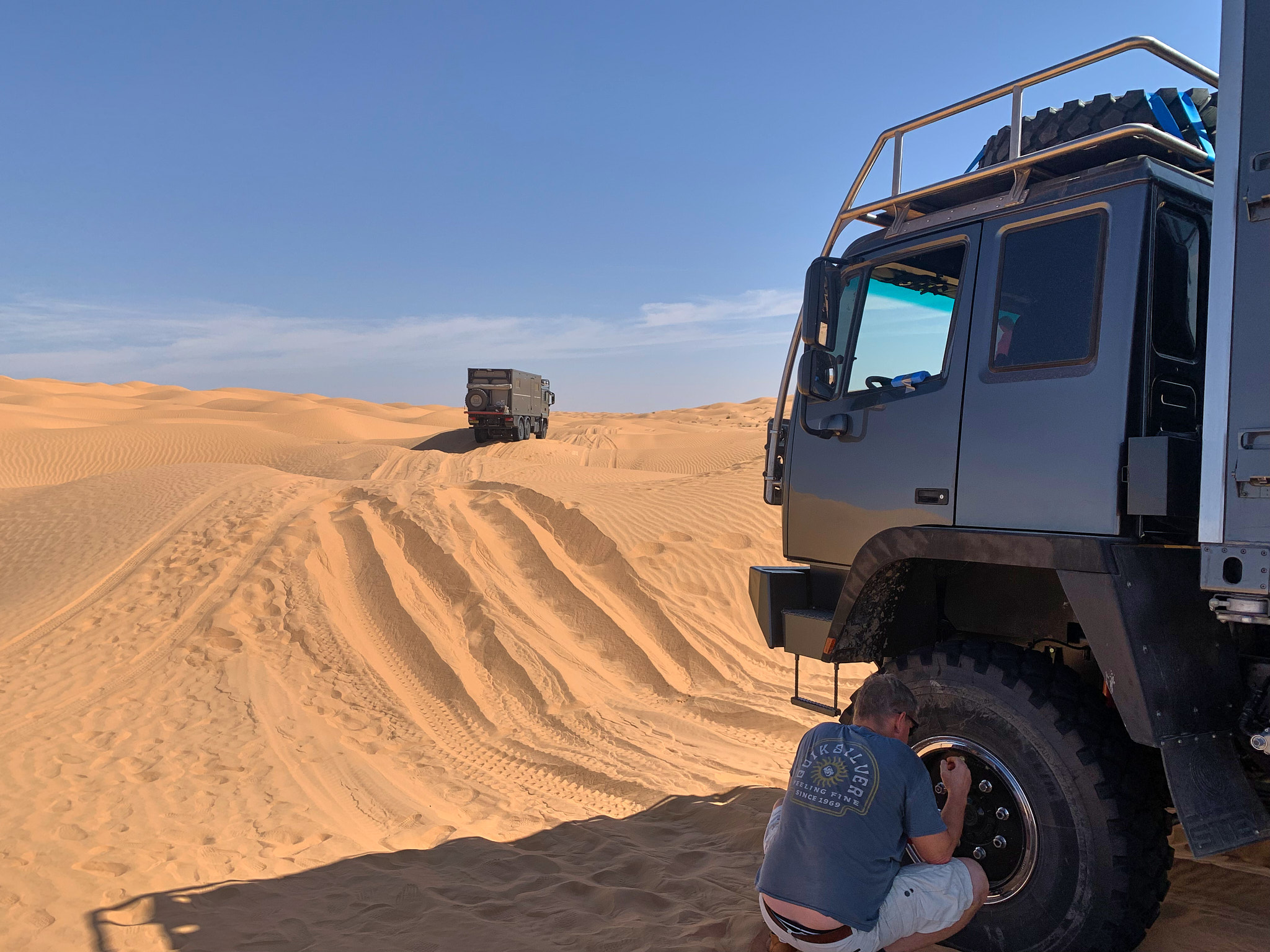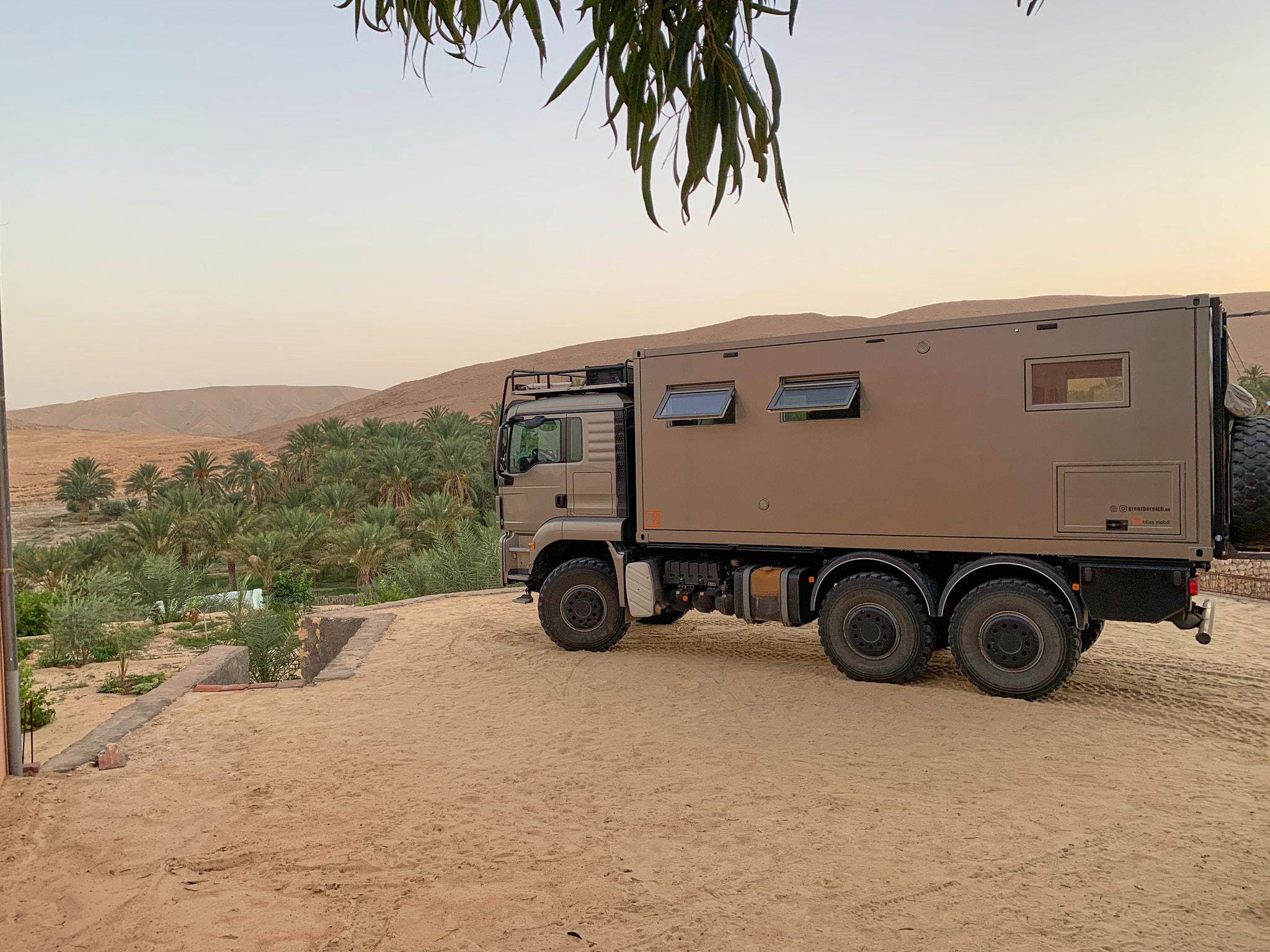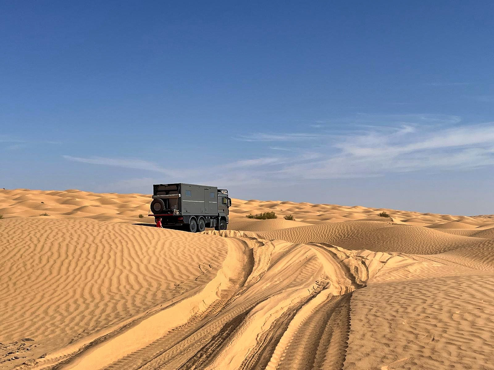 Wir wollten weiter nach Douz, dem Tor zur Sahara. Dort wollten wir unsere Freunde von der Fährüberfahrt treffen und mit ihnen ein paar Ausflüge in die Wüste machen. Etwa 160 km hatten wir von unserem Strand nach Douz zurückzulegen. Unsere Abfahrt verspätete sich aber etwas, da der Wind so sehr aufgefrischt hatte, dass er sich zu einem unangenehmen Sandstürmchen entwickelt hatte. Es flog dermaßen Sand umher, dass Schluppsi seinen Lieblingsplatz unter der Fahrerkabine auf dem Motorventildeckel auf gar keinen Fall verlassen wollte 😂. Nach etwa zwei Stunden legte sich der Wind und Schluppsi entschied, dass es jetzt losgehen kann. So konnten wir dann doch noch starten.