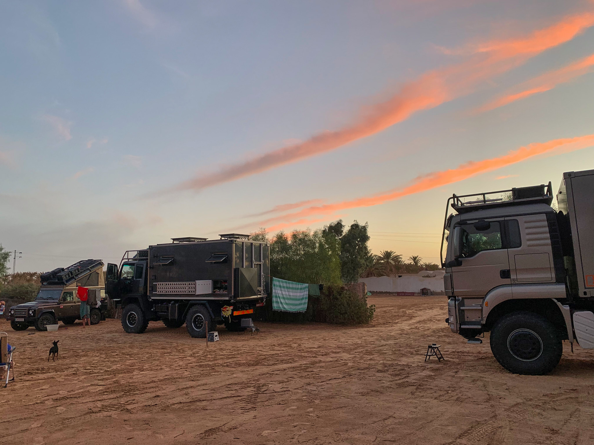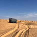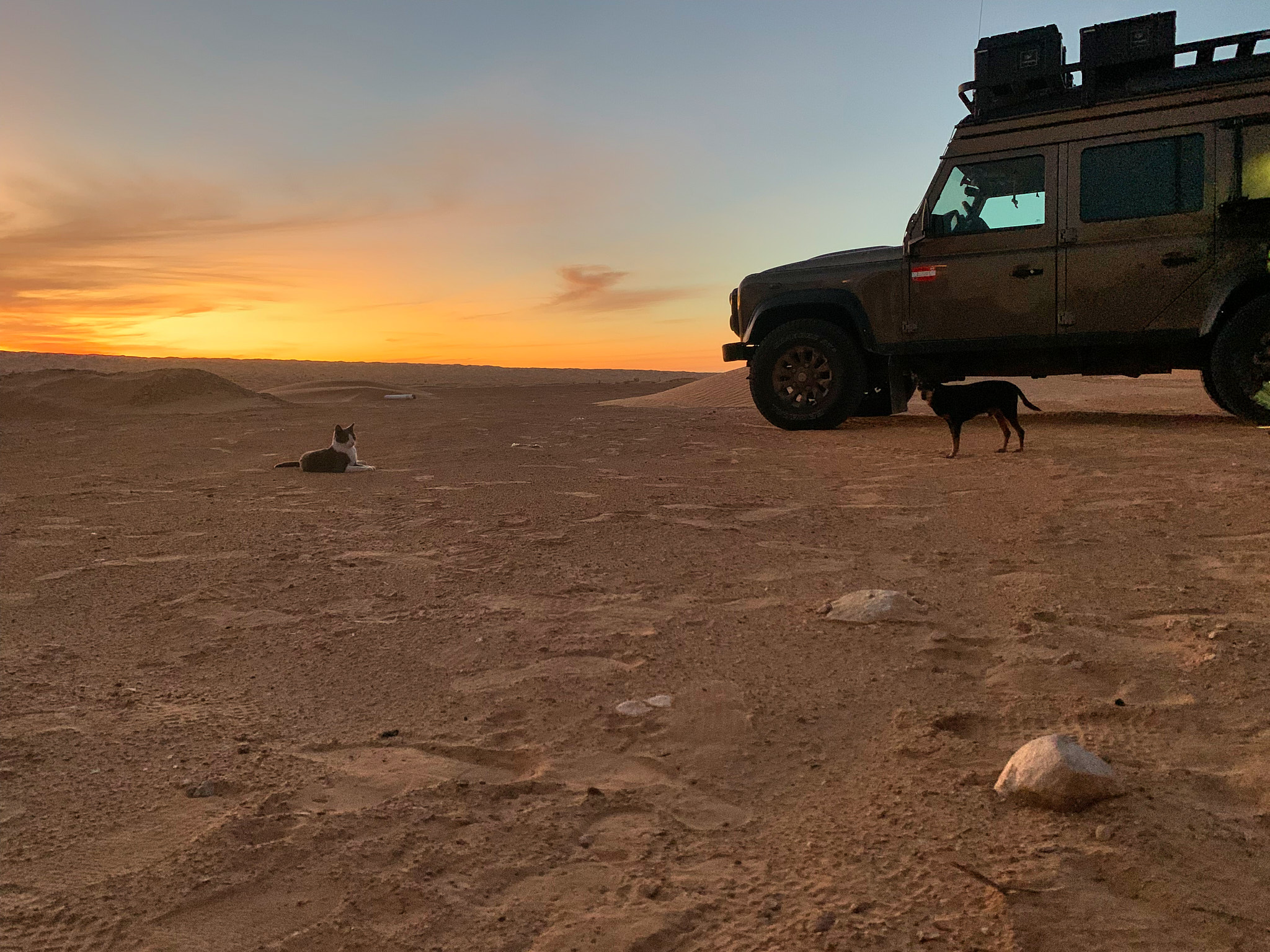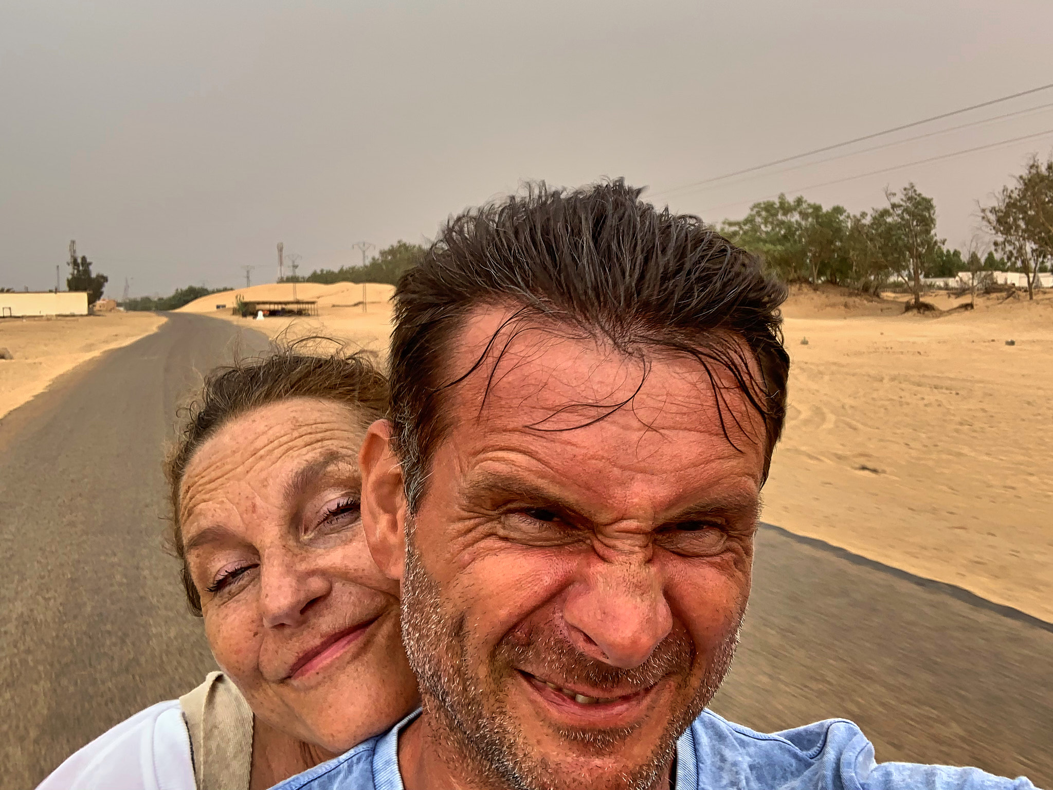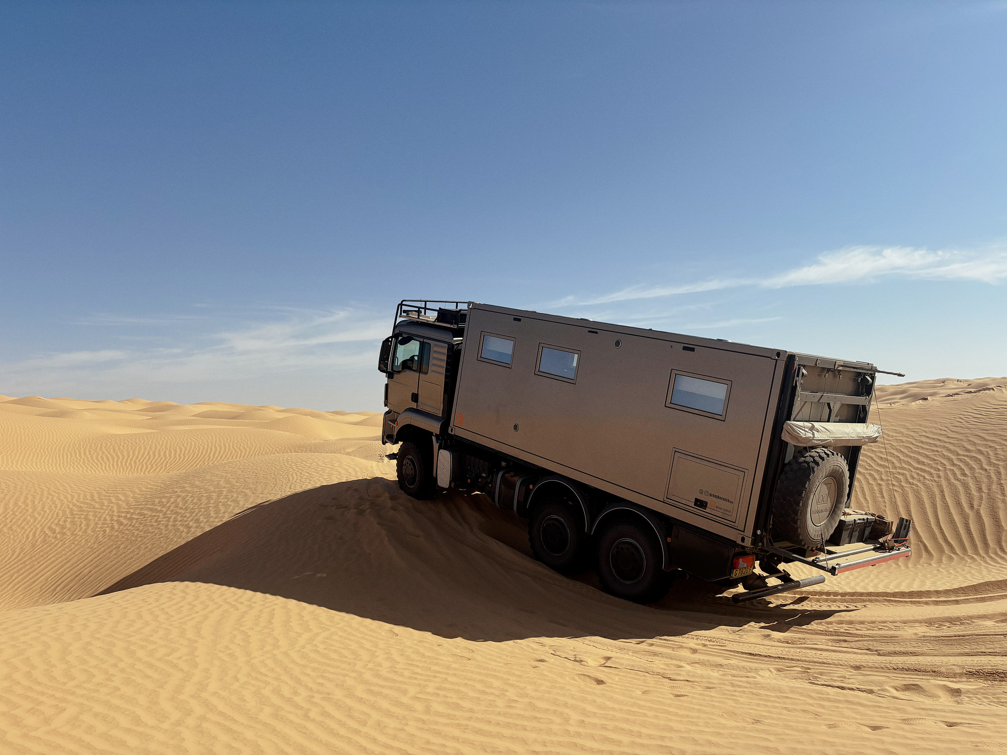 Wir wollten weiter nach Douz, dem Tor zur Sahara. Dort wollten wir unsere Freunde von der Fährüberfahrt treffen und mit ihnen ein paar Ausflüge in die Wüste machen. Etwa 160 km hatten wir von unserem Strand nach Douz zurückzulegen. Unsere Abfahrt verspätete sich aber etwas, da der Wind so sehr aufgefrischt hatte, dass er sich zu einem unangenehmen Sandstürmchen entwickelt hatte. Es flog dermaßen Sand umher, dass Schluppsi seinen Lieblingsplatz unter der Fahrerkabine auf dem Motorventildeckel auf gar keinen Fall verlassen wollte 😂. Nach etwa zwei Stunden legte sich der Wind und Schluppsi entschied, dass es jetzt losgehen kann. So konnten wir dann doch noch starten.