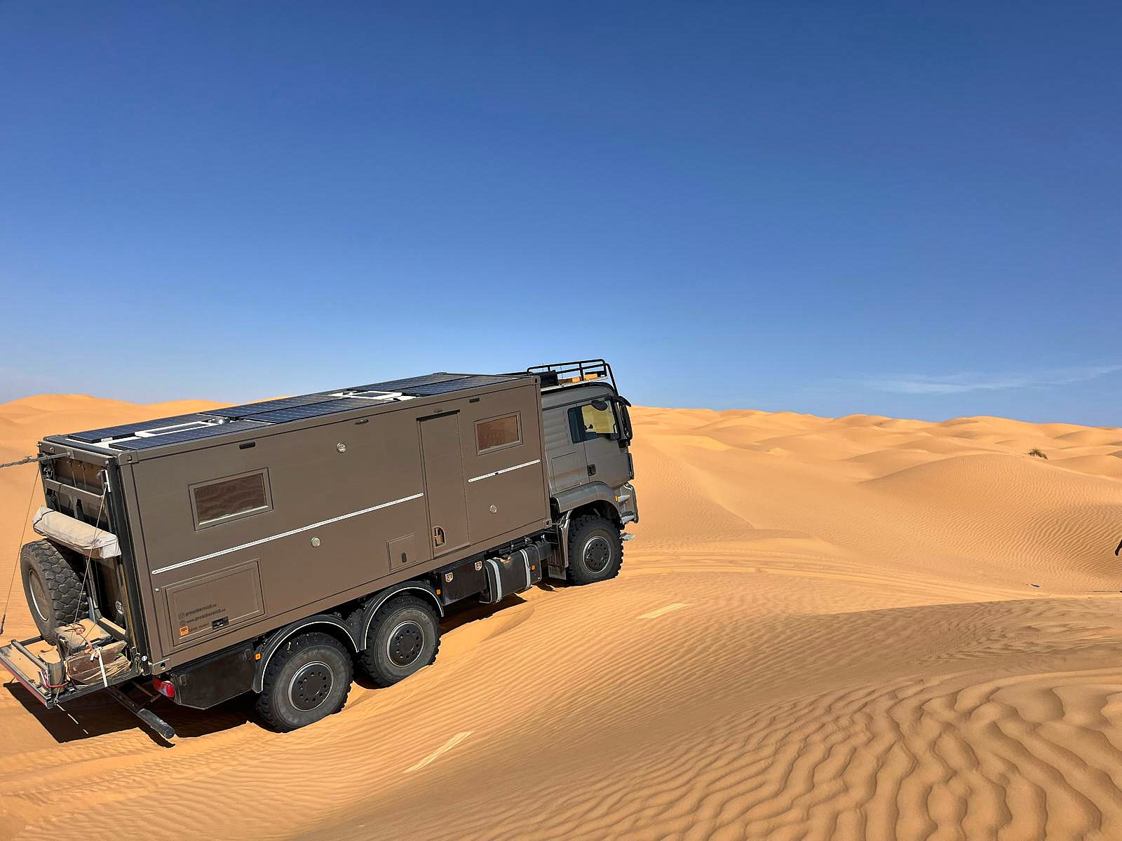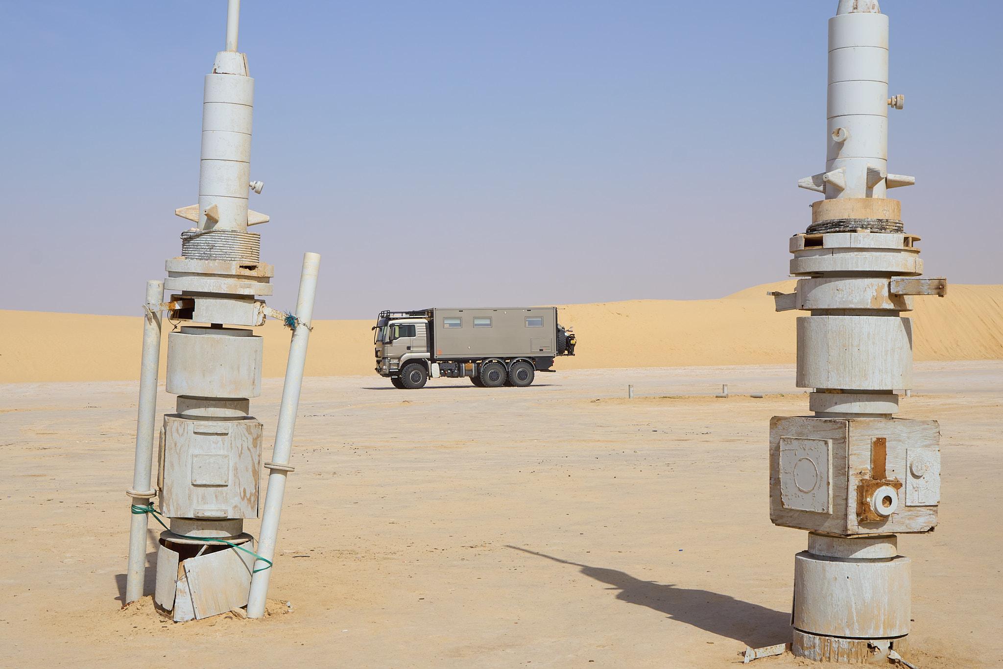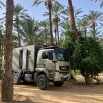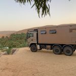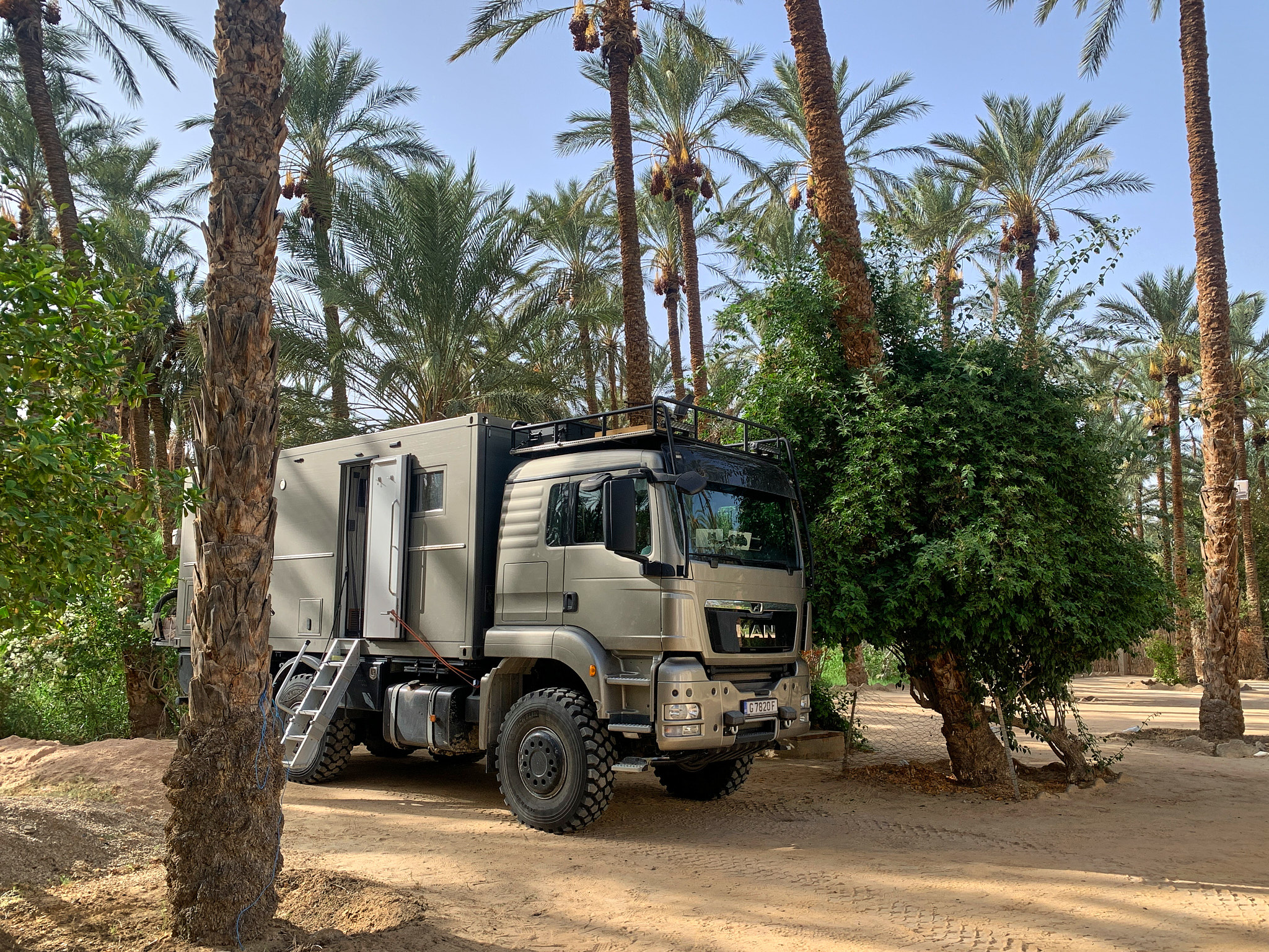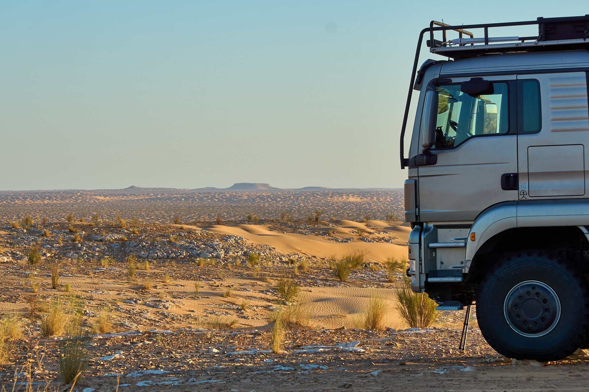 Wir wollten weiter nach Douz, dem Tor zur Sahara. Dort wollten wir unsere Freunde von der Fährüberfahrt treffen und mit ihnen ein paar Ausflüge in die Wüste machen. Etwa 160 km hatten wir von unserem Strand nach Douz zurückzulegen. Unsere Abfahrt verspätete sich aber etwas, da der Wind so sehr aufgefrischt hatte, dass er sich zu einem unangenehmen Sandstürmchen entwickelt hatte. Es flog dermaßen Sand umher, dass Schluppsi seinen Lieblingsplatz unter der Fahrerkabine auf dem Motorventildeckel auf gar keinen Fall verlassen wollte 😂. Nach etwa zwei Stunden legte sich der Wind und Schluppsi entschied, dass es jetzt losgehen kann. So konnten wir dann doch noch starten.