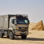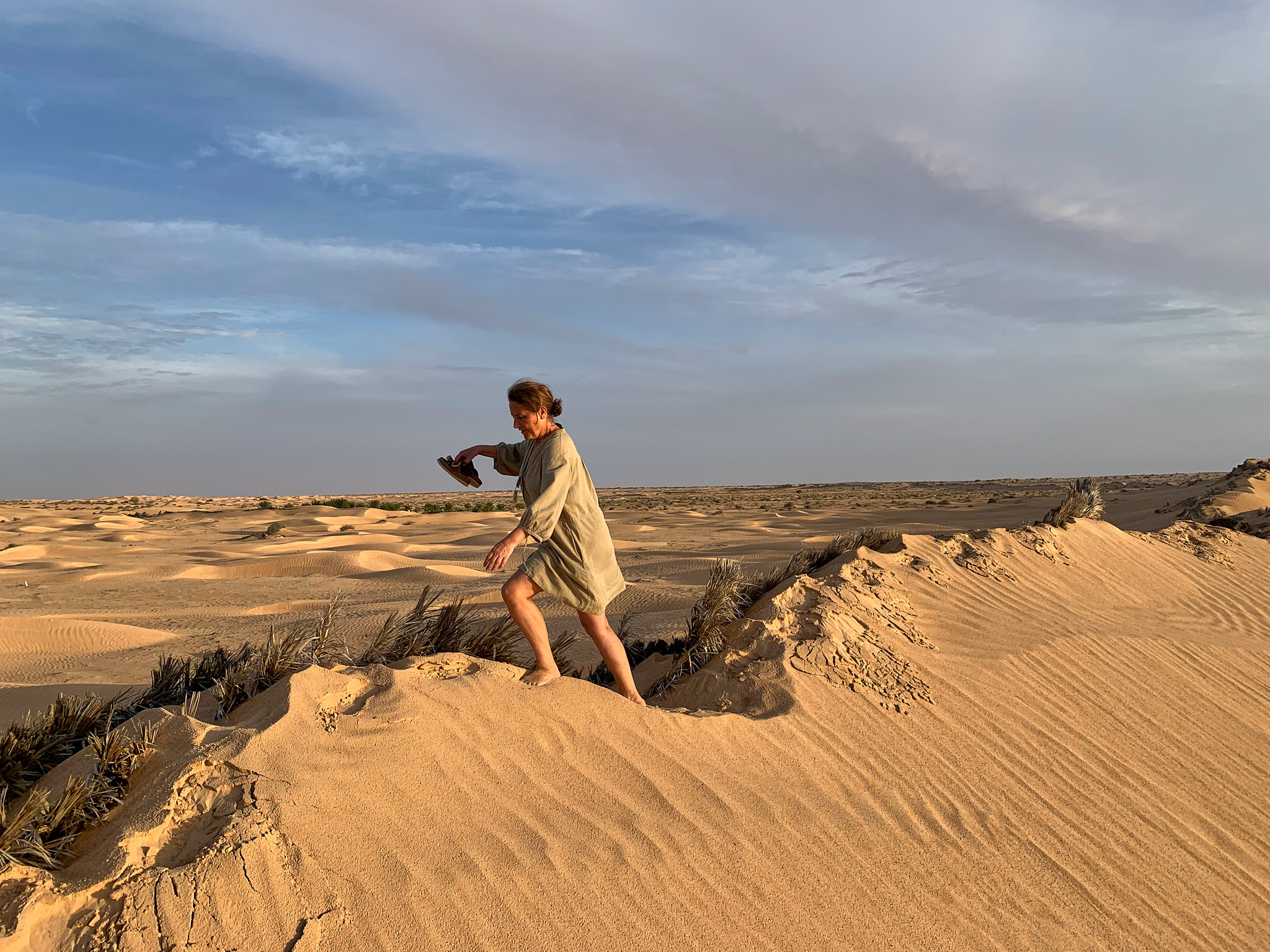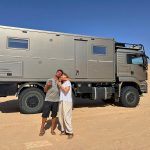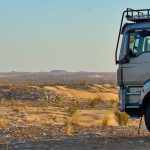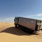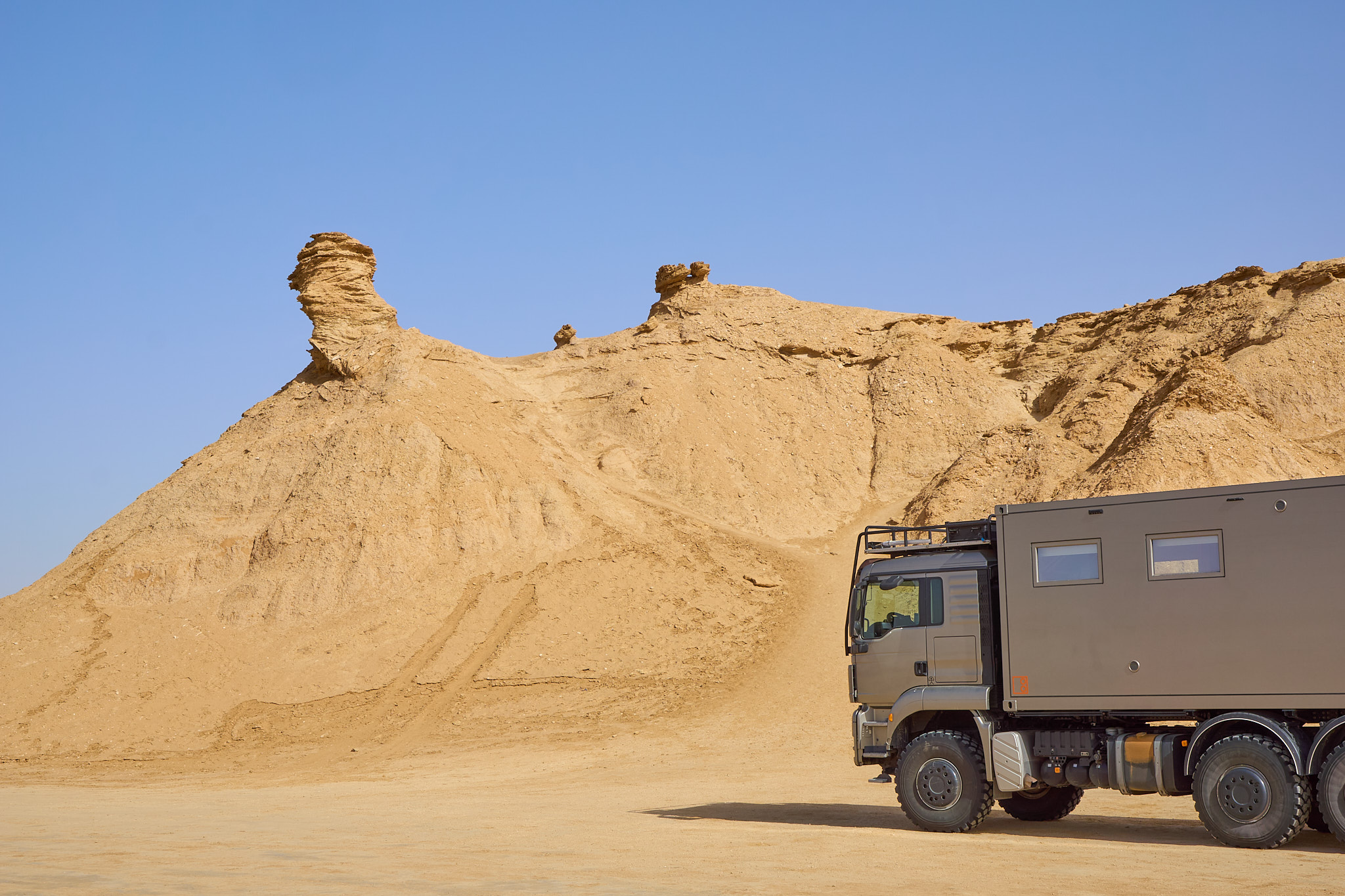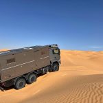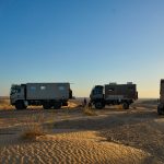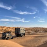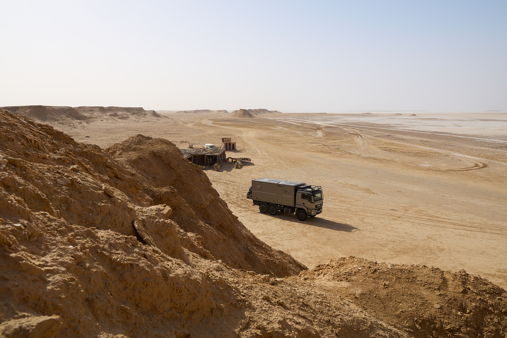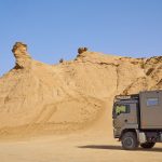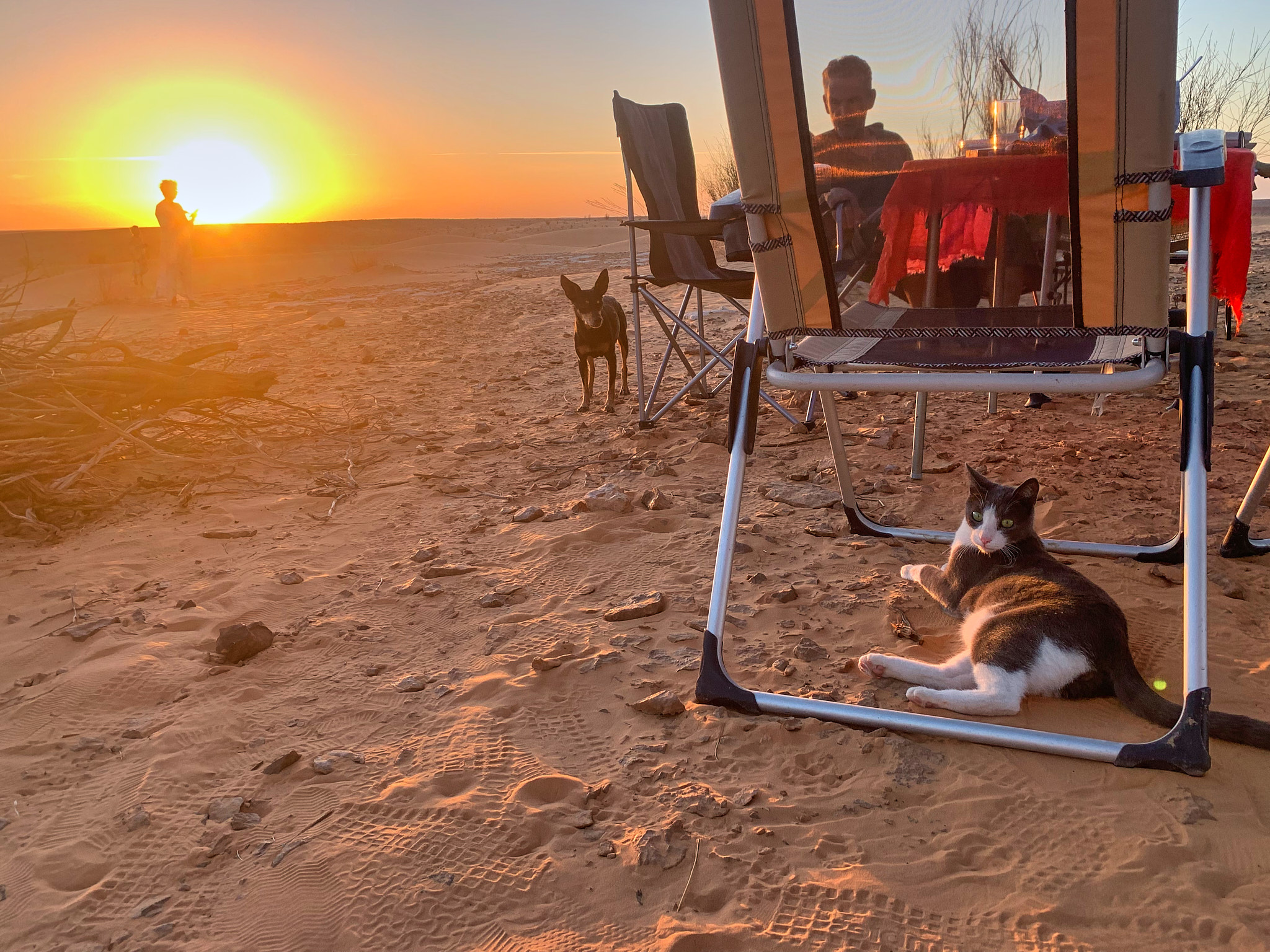 Wir wollten weiter nach Douz, dem Tor zur Sahara. Dort wollten wir unsere Freunde von der Fährüberfahrt treffen und mit ihnen ein paar Ausflüge in die Wüste machen. Etwa 160 km hatten wir von unserem Strand nach Douz zurückzulegen. Unsere Abfahrt verspätete sich aber etwas, da der Wind so sehr aufgefrischt hatte, dass er sich zu einem unangenehmen Sandstürmchen entwickelt hatte. Es flog dermaßen Sand umher, dass Schluppsi seinen Lieblingsplatz unter der Fahrerkabine auf dem Motorventildeckel auf gar keinen Fall verlassen wollte 😂. Nach etwa zwei Stunden legte sich der Wind und Schluppsi entschied, dass es jetzt losgehen kann. So konnten wir dann doch noch starten.