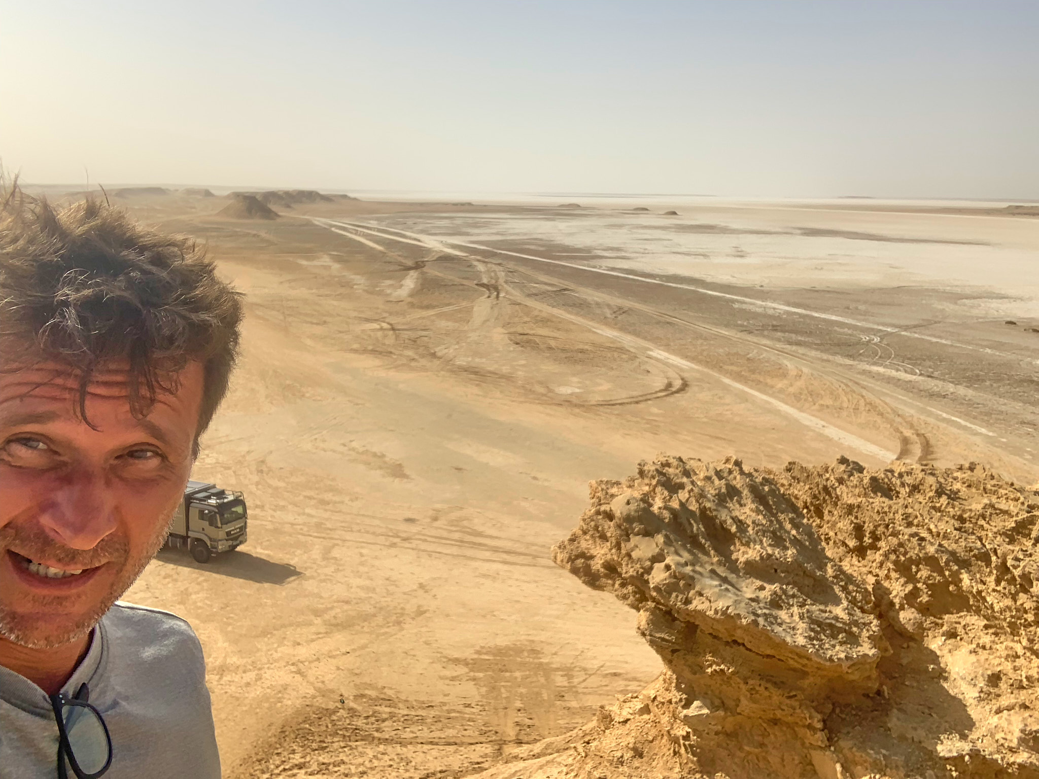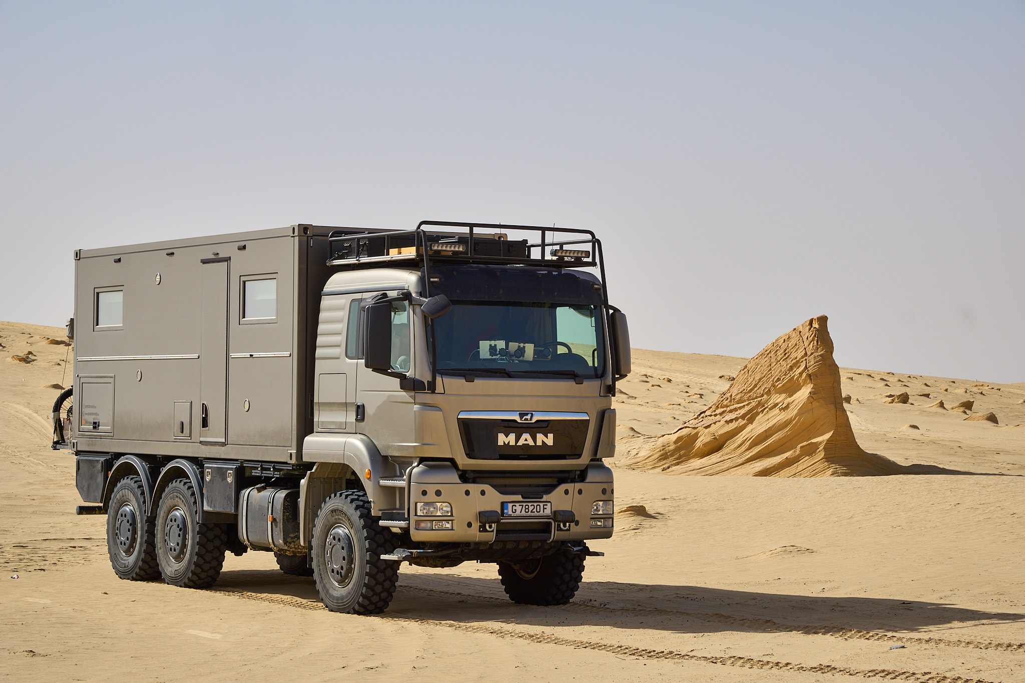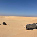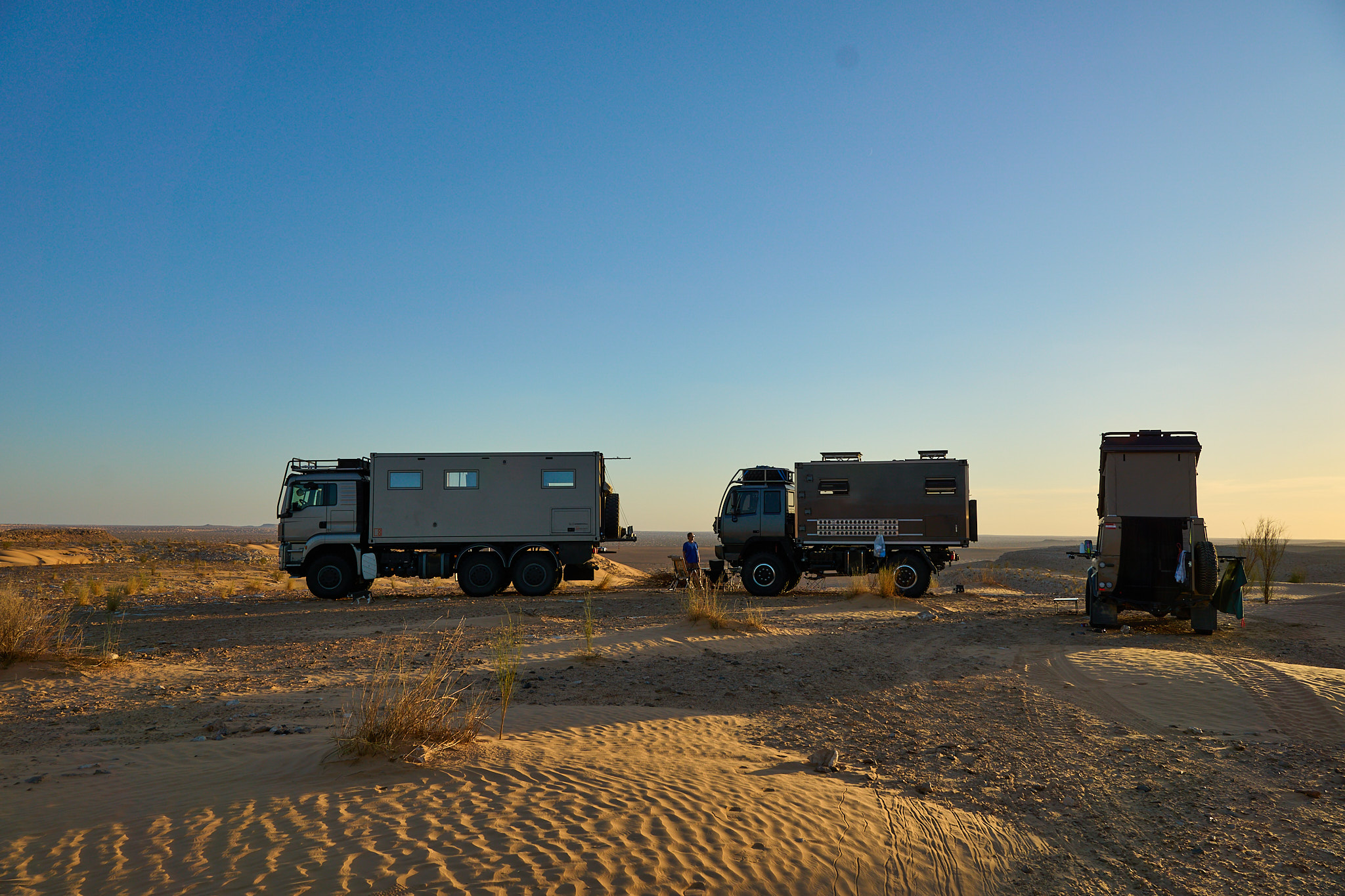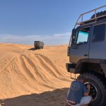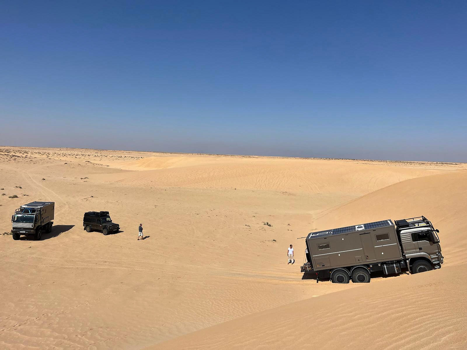 Eigentlich eine vergleichsweise viel befahrene Route, da wir aber noch sehr früh in der Saison waren und es über den Sommer einige Sandstürme gab, war die Strecke nicht immer eindeutig zu identifizieren. An einigen Stellen fuhren wir neue Spuren in die Dünen. In der Auffahrt zu einem Dünenkamm blieb Bernhard mit seinem Landy stecken. Georg und ich waren mit den LKWs bereits oben. Da ein Wenden an dieser Stelle aufgrund der recht steil abfallenden Dünen neben unserem Track nicht möglich war, konnten wir nicht mal eben mit einem Seil den Landy befreien. Also mussten wir der Sache mit Schippe und Sandblech zu Leibe rücken, als plötzlich ein Landcruiser voll mit Touristen und einem einheimischen Guide hinter uns auftauchte. Dieser kam dann hinter dem Landy zum Stehen und ich fragte ihn, ob er Bernhard mal eben 5 Meter rückwärts ziehen könnte, damit dieser nochmal Anlauf nehmen könnte. Er sagte mir: „Sorry – not possible!“ und gab mir zu verstehen, dass er keinen Bock hätte, Touristen rauszuziehen, die es nicht hinbekommen. Ähhh – echt jetzt? Nochmal zum Verständnis: Das Seil lag schon da, man hätte es nur einhängen müssen und der Kollege hätte rückwärts fahren müssen. Zeitaufwand maximal eine Minute.