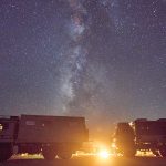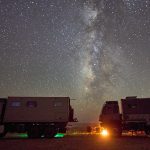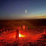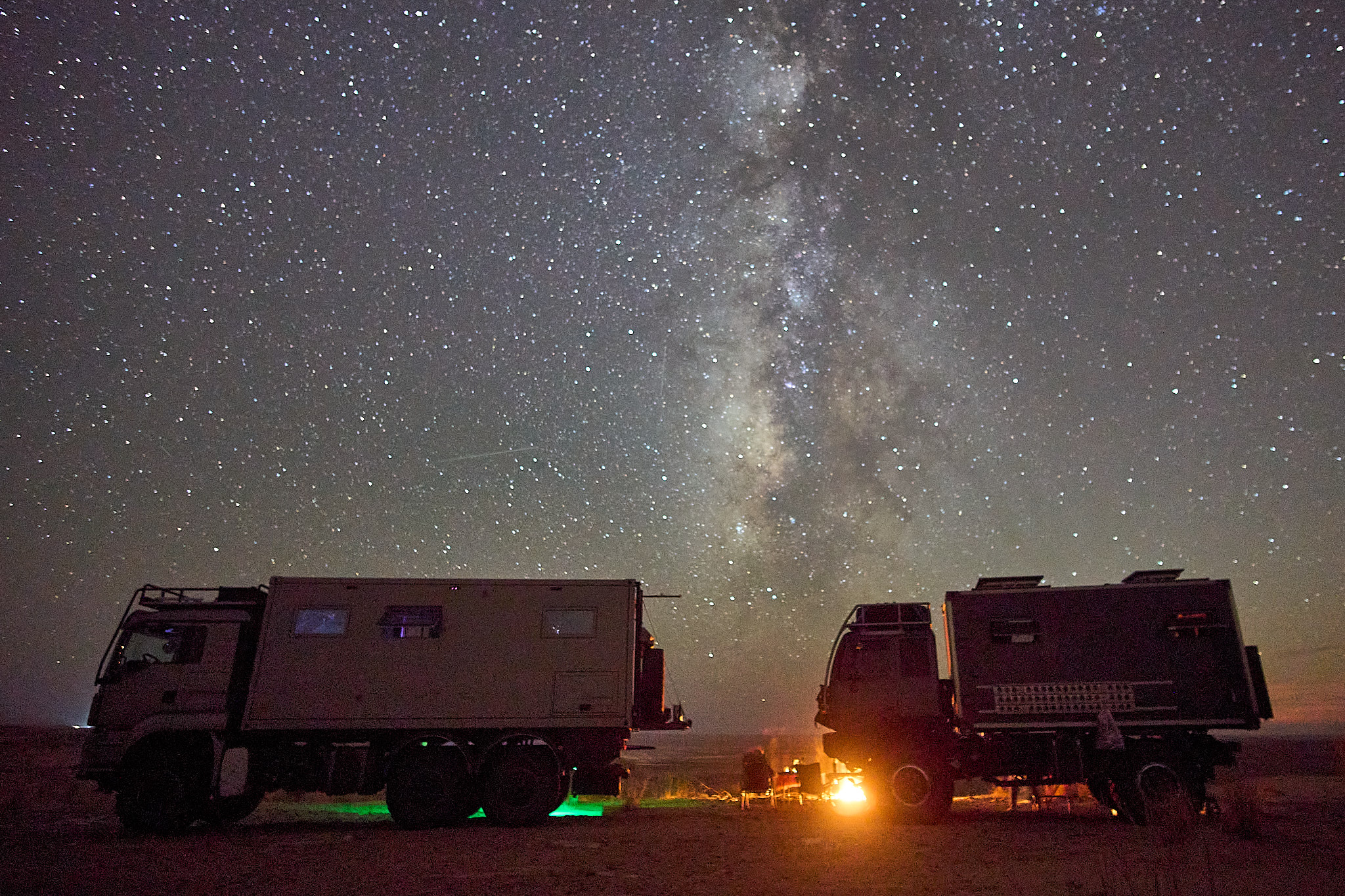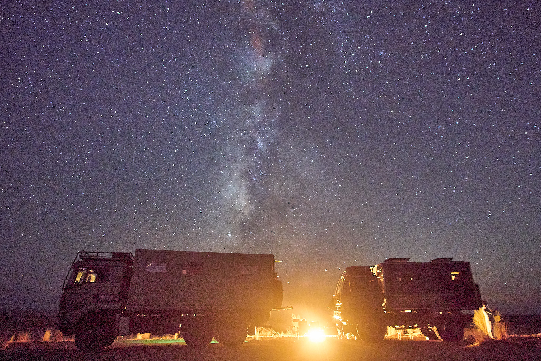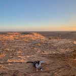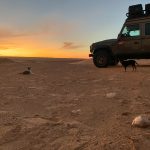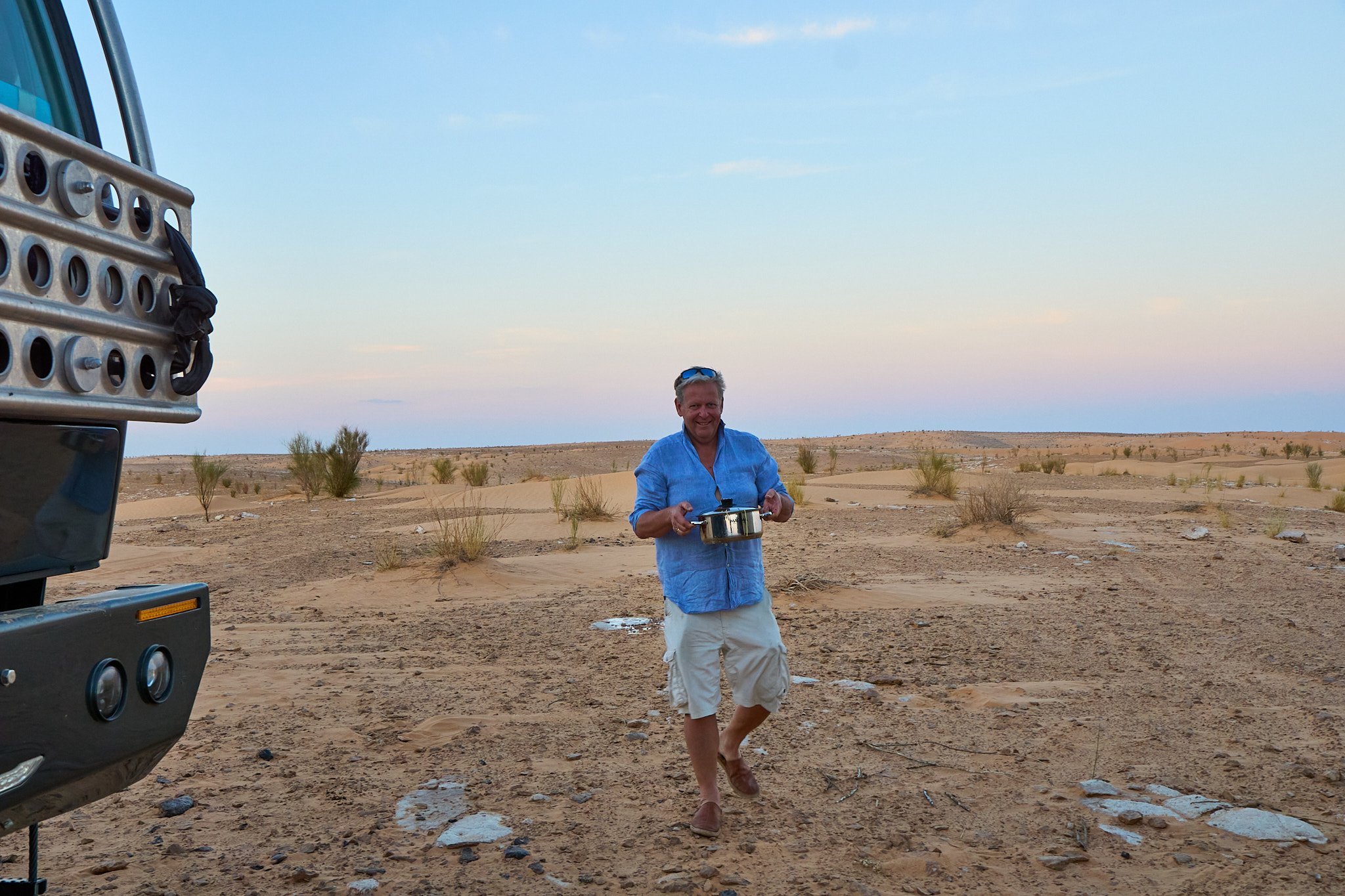 Wir stoppten kurz vor dem Nationalpark, den wir auf dem Hinweg auf der Westseite umfahren hatten. Laut GPS sollte es von hier eine Piste nach Ksar Ghilane geben, die war aber unter einem meterhohen Dünenfeld verschwunden. Wir beschlossen also, die Nacht auf dem Plateau am Südrand des Parks zu verbringen. Nach etwas Suchen und ein paar Fehlversuchen fanden wir auch einen Weg nach oben. Der Platz war der bisher mit weitem Abstand schönste Übernachtungsplatz der bisherigen Tour – und auch auf unserer Gesamtrangliste recht weit vorne…… ein guter Platz, um in Bernhards Geburtstag hinein zu feiern 😉
