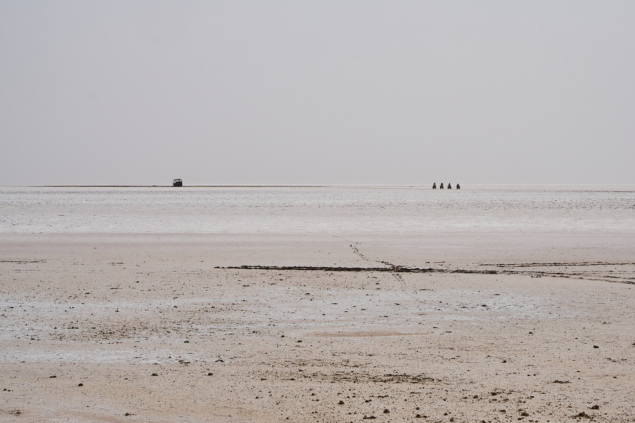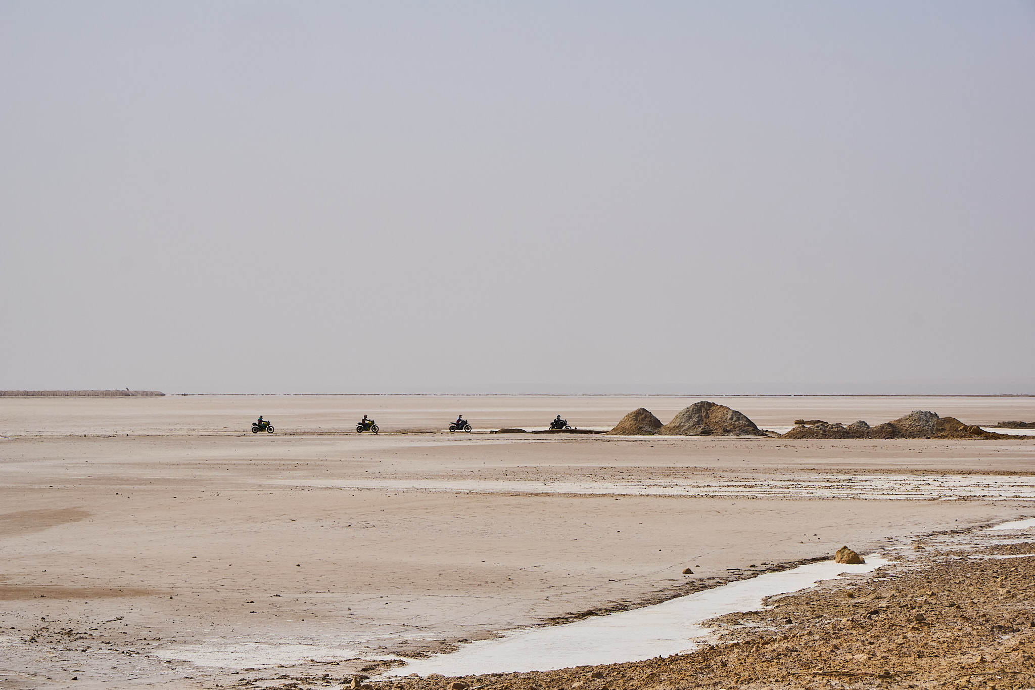 Auf dem Weg dorthin überquerten wir den Chott el-Jerid, einen relativ trockenen Salzsee – allerdings auf der gut ausgebauten Hauptstraße, nicht auf einer der unkalkulierbaren Pisten 😉 Ein paar Motorradfahrer waren da mutiger und gaben damit ein tolles Fotomotiv ab. Naja, die müssen ja auch nicht so viel buddeln wie wir, falls es nicht klappt.