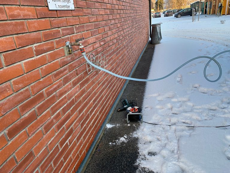 In Vikersund war ein Ver- und Entsorgungsplatz verzeichnet, mit frei zugänglichen Duschen, ich wollte also einen Schlauch von innen nach außen legen und so unser Wasserproblem lösen. Leider war alles verschlossen und die Außenstellen, wie zu erwarten abgestellt. Als wir gerade weiter wollten kam ein Mitarbeiter der Gemeinde, von der der Platz zur Verfügung gestellt wurde, mit seinem Service Auto vorgefahren. Ich fragte ihn ob es eine Möglichkeit für uns gibt an Wasser zu kommen. Der Kollege war genauso nett wie alle anderen Norweger, die wir bisher getroffen haben und sagte sofort, er könne uns die Leitung aufdrehen. Cool, Schläuche ausgeladen, die sind übrigens ganz schön störrisch bei inzwischen -12 Grad, und alle Verbindungen hergestellt. Wasser marsch – es marschierte aber nicht. Es erforderte doch noch einige Überredungskunst mit dem Heißluftfön bis ein plätschern im Tank zu hören war. Solange es fließt, friert es auch nicht ein, so hatten wir etwa 40 Minuten später wieder einen nahezu vollständig gefüllten Tank. Beim wieder einrollen sind die Schläuche übrigens bei der Temperatur noch ein bisschen störrischer als beim abrollen.
