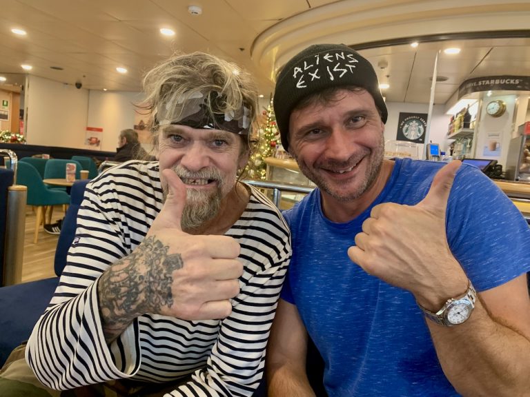 Direkt nach der Einfahrt in die relativ kleine Fähre spricht uns jemand mit einem amerikanischen Akzent an, der voll von unserem Auto begeistert ist. Ich beantworte seine Fragen und wir quatschen im Restaurant des Schiffes weiter. Er ist mit ein paar Jungs unterwegs, die, wie auch er, nach Heavy Metal Musikern aussehen. Es stellt sich heraus, dass er Chris Holms, der ex Gitarrist der Band W.A.S.P. ist und er gerade mit seiner aktuellen Band auf Irland und England Tournee ist.