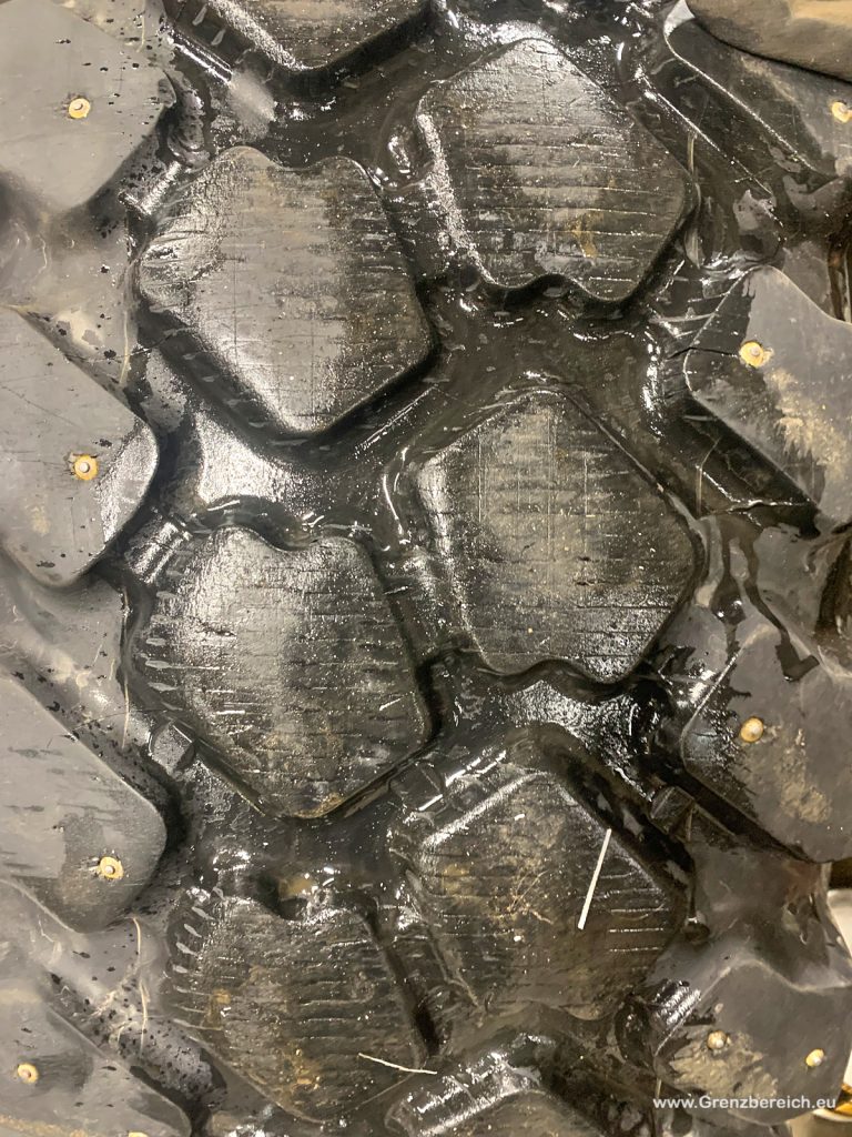 Wir hatten uns ja daher schon direkt bei der Ankunft in Norwegen Spikes in die Reifen schießen lassen (hier zum Artikel), da ich ja über die mangelnden Winterfähigkeiten der Reifen im Bild war. Das ist soweit auch fahrbar, Bergauf ging eh fast immer, dank Allrad und diverser Sperren. Kurvenfahrten waren soweit auch ganz OK, auch wenn sich die Lenkung schon ständig sehr weich anfühlt und das Teil auch immer mal über alle Räder schiebt, aber nicht kritisch. Nicht übertreiben vorausgesetzt! Und den Speed der norwegischen LKW Fahrer annehmen ist auch keine gute Idee……