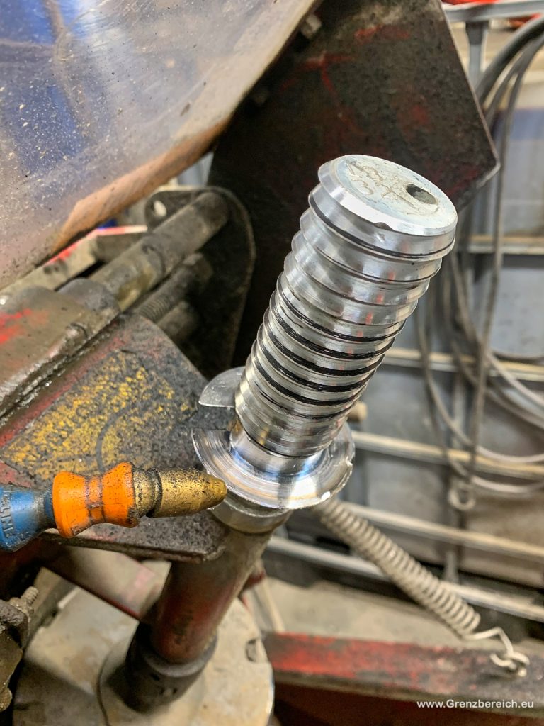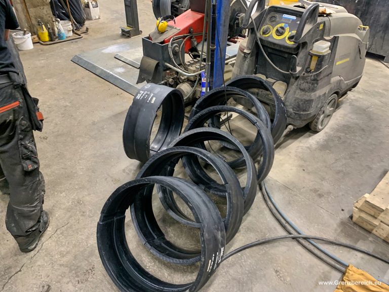 Die Demontage der Ringe ist eine größere Sache und die meisten sagen, man muss eine spezielle Vorrichtung haben um den Druck aufbauen zu können, dass man den Sprengring rausbekommt. Die Norweger haben das mit der normalen Maschine geschafft, mit etwas Gewalt, aber sie sind raus. Der Teil entfällt natürlich, wenn man die Ringe nicht drin hat, dann dürfte die ganze Aktion recht schnell erledigt sein – so hat es fast 7 Stunden gedauert bis alle 6 Reifen + Ersatzrad von dem Mist befreit und mit Schnitten versehen waren.