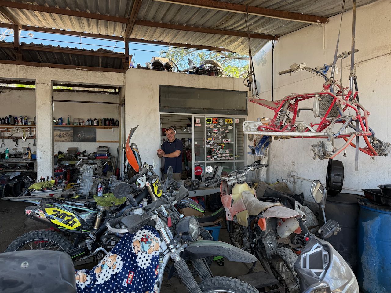 Heute lief es nicht ganz so rund – die kleine Honda mit gleich 3 Platte Reifen – die mexikanischen Schläuche sind nicht sooo der Knaller (manche kann man schon beim aus dem Paket nehmen zerstören 😂), Kays Ktm: keine Leistung und das Öl will sie auch nicht bei sich halten, das Bike von Thomas kämpfte mit Startschwierigkeiten und Aussetzern. Zum guten Schluss gab es auch noch einen etwas doofen Crash der mit einem ziemlich dicken Fuß bei Jörg endete. So kommt einer nach dem anderen zurück in Johns Garage und nimmt am fröhlichen Schrauben und Jammern teil 😂😂